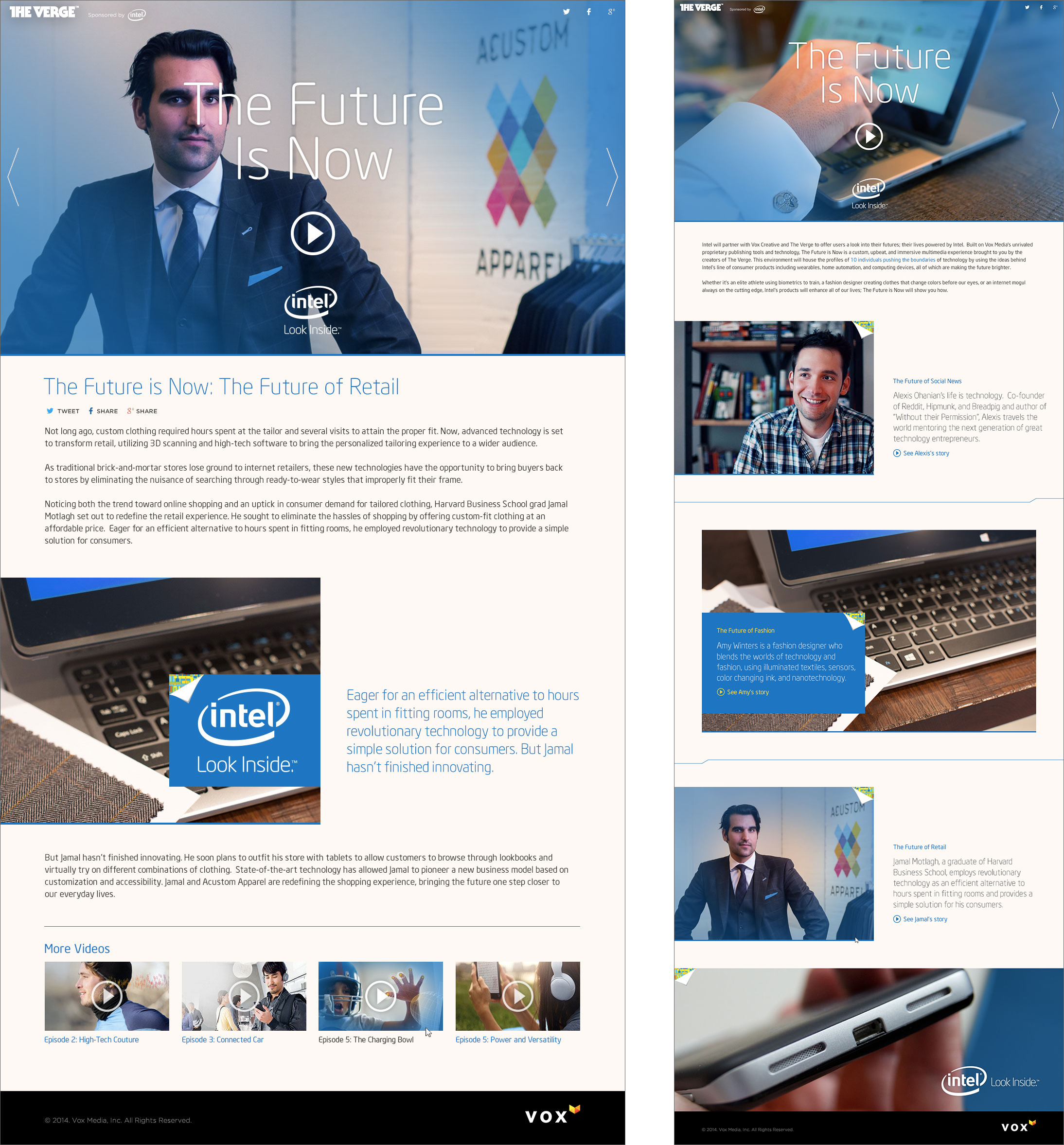 In 2016/17, I drove the strategic vision and execution of a custom branded content initiative for Intel, showcasing how technology is shaping our future. As Vox Media’s first branded content initiative, this campaign established a scalable, repeatable framework for future projects. The effort unfolded in multiple phases: first, the development of 10 long-form branded content pages; next, the creation of high-impact ad units designed to drive traffic to these stories; and finally, an agile pivot to native advertising when initial content didn't meet expected KPIs. The campaign ultimately exceeded performance benchmarks and became foundational for Vox Media's branded content strategy moving forward.